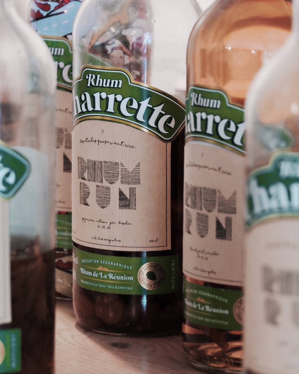 Réalisation d’étiquettes pour des bouteilles de Rhum arrangé avec pour base le célèbre Rhum Charrette.