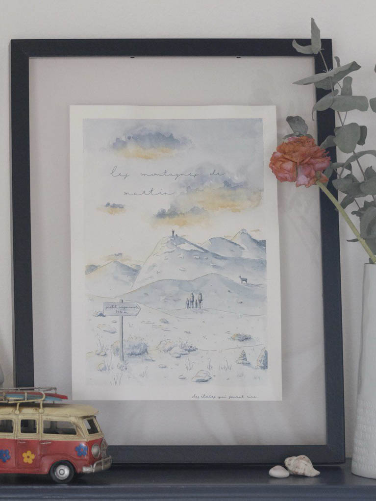 Illustration personnalisée à l’aquarelle pour Martin, il adore les montagnes et surtout celle de son dernier voyage dans les Pyrénées, le Petit Vignemale. Ses parents ont voulu immortaliser ce joli souvenir.