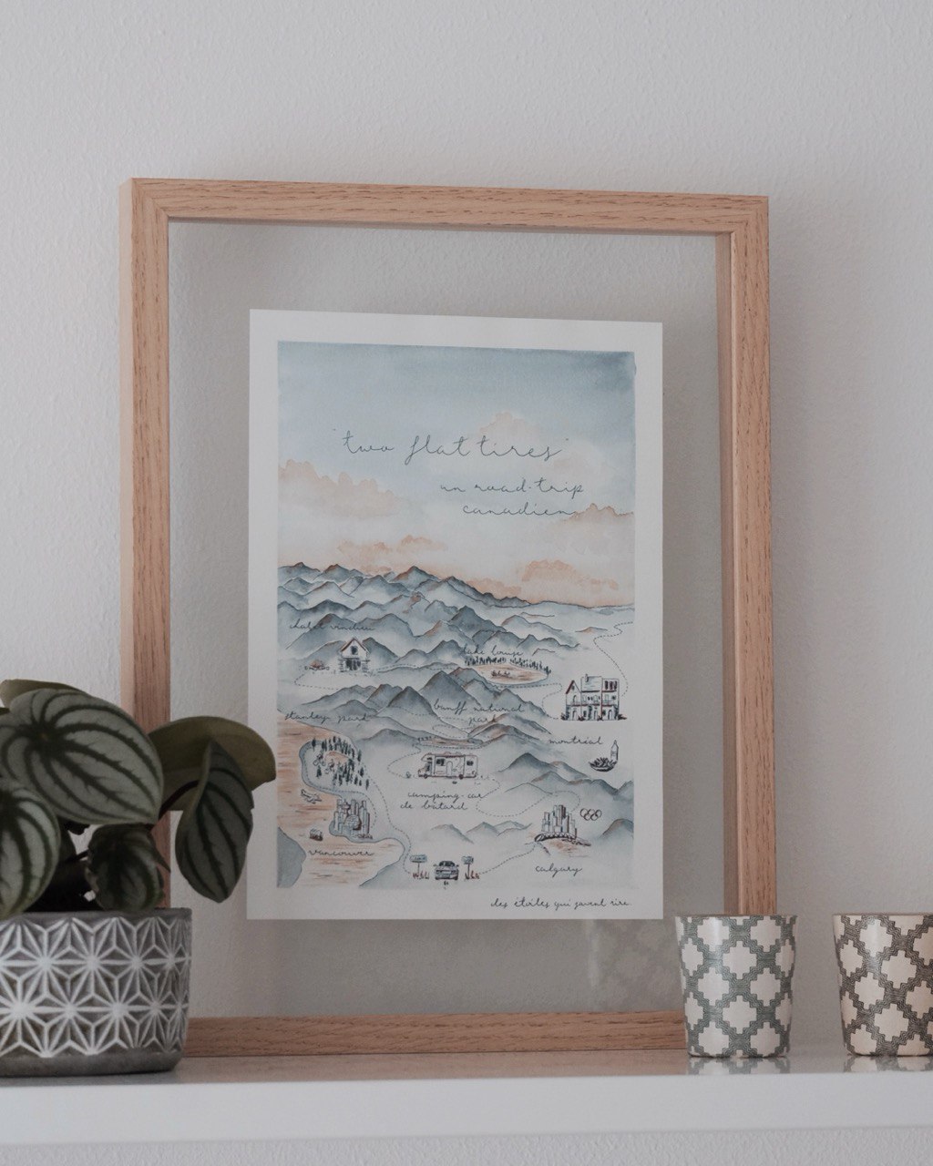 Une cartographie sensible d’un voyage au Canada, où les lieux sont des souvenirs à conserver. Entre les paysages grandioses et les jolis moments, cette illustration invite à revivre les étapes marquantes de ce voyage.